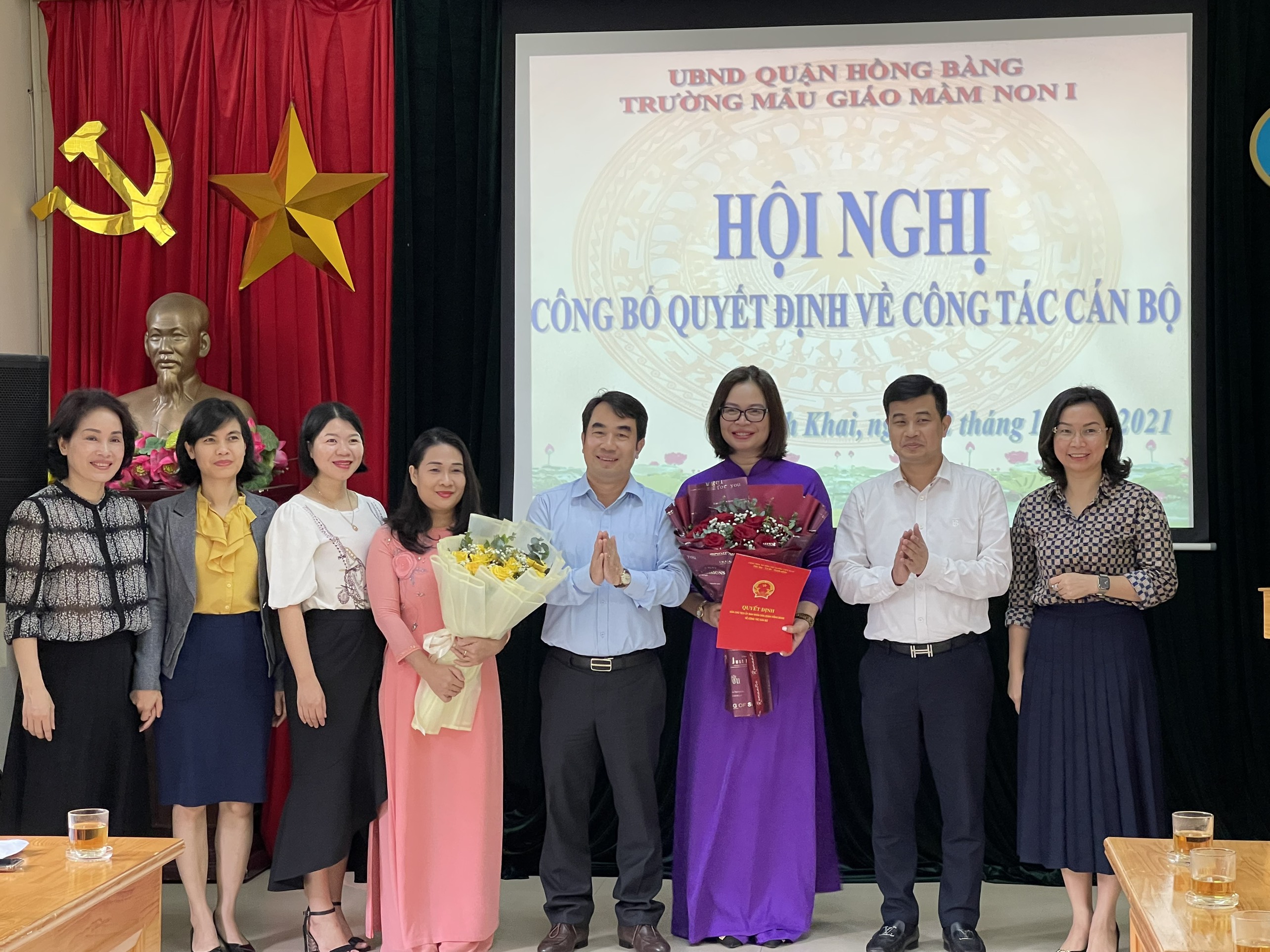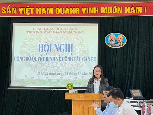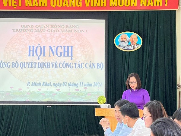 Ngày 02/11/2021 tại hội nghị Công bố quyết định về công tác cán bộ. Đồng chí Nguyễn Thị Thu Huyền- Nguyên Phó Hiệu trưởng trường Mẫu giáo Mầm non 1 được điều động giữ chức vụ Phó Hiệu trưởng trường Mẫu giáo Thượng Lý và đồng chí Đặng Thị Liễu - Nguyên Hiệu trưởng trường Nhà trẻ 19/5 về giữ chức vụ Phó Hiệu trưởng trường Mẫu giáo Mầm non 1. Nhà trường xin gửi lời chào tạm biệt tới đồng chí Nguyễn Thị Thu Huyền, người đã đồng hành cùng trường Mẫu giáo Mầm non 1 trong suốt 23 năm qua. Chúc 2 đồng chí sang ngôi trường mới, gặt hái nhiều thành công!