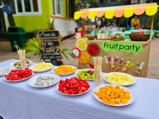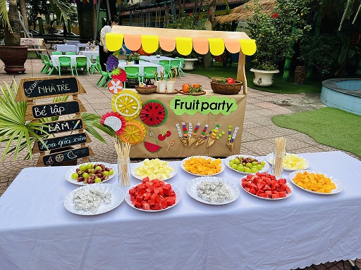 Được tự tay chế biến cho bữa ăn đệm của mình, các bé khối Nhà trẻ: “Làm hoa quả xiên”; các